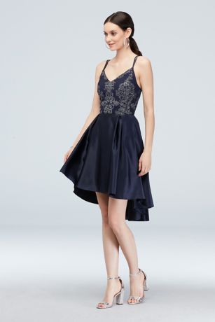 A swirling pattern of caviar beading decorates the bodice of this A-line, crisscross spaghetti-strap short dress, featuring a silky skirt with a high low hem. Throw your phone and your lip gloss in the convenient pockets so you can be on the dance floor all night long!