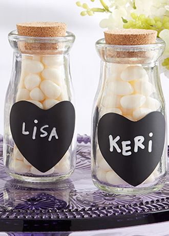 • Nostalgic glass milk bottle-shaped favor jar with cork stopper and heart-shaped, blackboard-writeable label