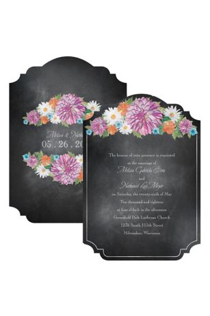 Dahlias daisies and more! A striking garden bouquet of blooms decorates this stylish chalkboard wedding invitation. Your wedding details print on the front with your names and date on the reverse.