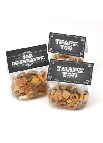 A fitting way to thank your guests for being a part of your big day with this clear cellophane bag filled with your choice of treat and topped with a cute chalkboard topper! Chalkboard-inspired treat topper cards are printed on one side with "Thank You" and the other with "For Celebrating" in white.