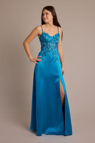 The sleek A-line prom dress is full of fun, thanks to floral appliques that cascade down the bodice.