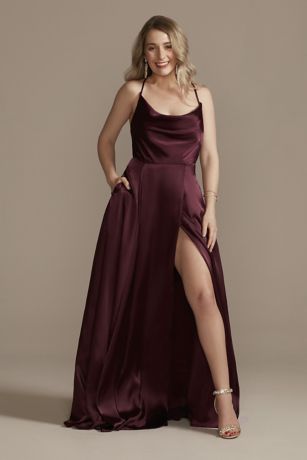 Wowza! This glam satin-like charmeuse bridesmaid dress makes its mark with a cowl neckline, lace-up back, full envelope skirt with slit, bra cups, and pockets.