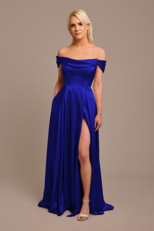 This silky charmeuse bridesmaid dress exudes grace and glamour, with off-the-shoulder swag sleeves, corset detailing on the bodice, and a skirt slit.