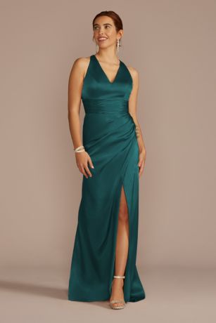 This stunning charmeuse bridesmaid dress features a flattering crisscross back detail that adds a touch of elegance to any bridal party. The smooth and silky charmeuse fabric drapes beautifully, creating a luxurious look that is perfect for any wedding. Available in a variety of colors to suit any wedding theme, this crisscross back dress is sure to make your bridesmaids feel beautiful and confident on your special day. Pair it with some sparkling accessories and heels for a complete and polished look. Shop now at David's Bridal to find the perfect dress for your bridal party!
