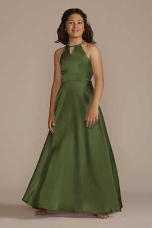 A keyhole at the neckline adds a cute touch to this silky, satiny charmeuse junior bridesmaid dress.