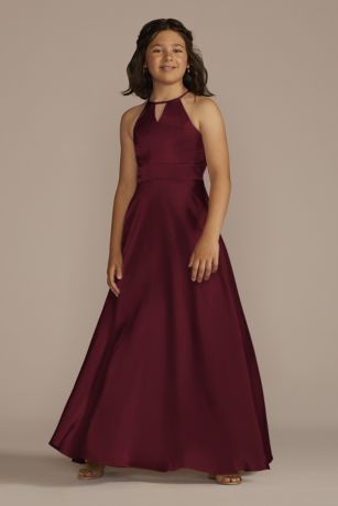 A keyhole at the neckline adds a cute touch to this silky, satiny charmeuse junior bridesmaid dress.