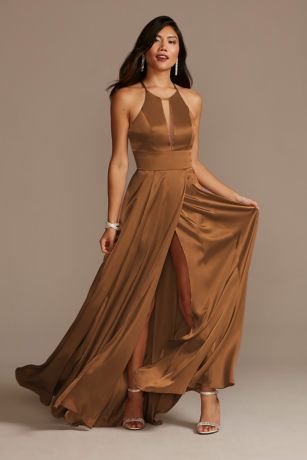 Made of satin-like charmeuse, this glamorous bridesmaid dress features a front illusion keyhole, crisscross spaghetti straps, and envelope skirt with pockets.