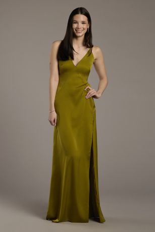 Turn heads in this charmeuse plunge seamed slim A-line dress, featuring a sleek silhouette with a plunging neckline and expertly placed seams for a flattering fit.
