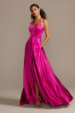Crafted from high-shine charmeuse satin, this radiant A-line dress is detailed with sleek spaghetti straps, a V-neckline, and an open-front skirt. A lace-up back adds flirty detail, while side pockets provide a convenient place for your cell phone while you're on the dance floor.