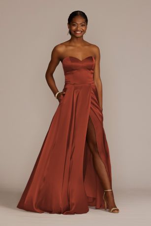 Get ready to shine in this glam strapless bridesmaid dress made of silky satin-like charmeuse with sexy bodice seaming and a high skirt slit. Features bra cups.