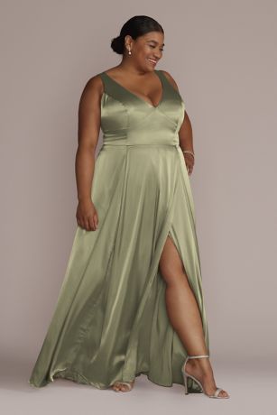 This stunning charmeuse tank V-neck bridesmaid dress from David's Bridal is the perfect choice for any bridal party. The sleek and elegant design features a flattering V-neckline, triangle waist, and a subtle slit that adds a touch of sophistication. The charmeuse fabric drapes beautifully, creating a luxurious look that is sure to turn heads. Whether you're a bridesmaid or a guest at a wedding, this dress is a versatile option that can be dressed up or down depending on the occasion.