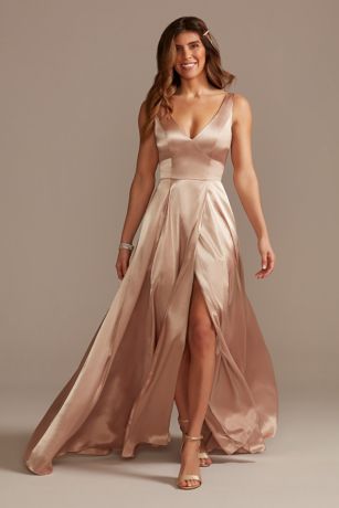 This stunning charmeuse tank V-neck bridesmaid dress from David's Bridal is the perfect choice for any bridal party. The sleek and elegant design features a flattering V-neckline, triangle waist, and a subtle slit that adds a touch of sophistication. The charmeuse fabric drapes beautifully, creating a luxurious look that is sure to turn heads. Whether you're a bridesmaid or a guest at a wedding, this dress is a versatile option that can be dressed up or down depending on the occasion.