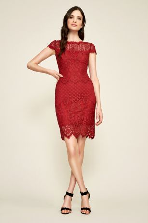 Fashioned from multi-patterned lace, this pretty short sheath dress is detailed with an illusion yoke, sheer cap sleeves, and a peekaboo hem.