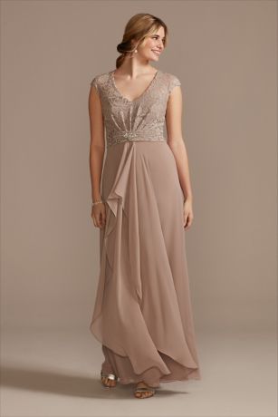 This flowy chiffon A-line dress is topped with a lace cap-sleeve overlay. A crystal embellishment and a flounce at the waist add pretty finishing touches.