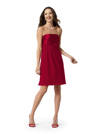 This short chiffon and charmeuse dress is beautiful with a flower applique detail on the chest. The draping from the bust line keeps the look flowing and soft. This dress is perfect for a casual wedding or can be dressed up for a more formal look.