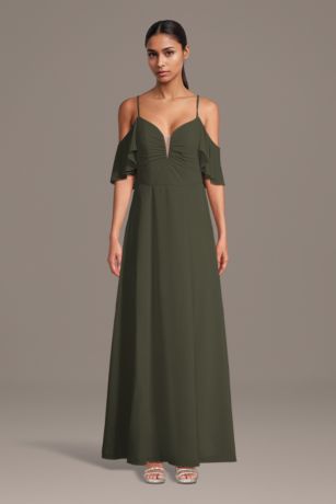 Soft chiffon flows gracefully on this A-line dress, styled with a chic notch neckline and airy cold-shoulder sleeves. A graceful look with a modern twist that's perfect for bridesmaids or any special occasion.