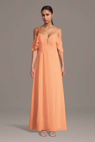 Soft chiffon flows gracefully on this A-line dress, styled with a chic notch neckline and airy cold-shoulder sleeves. A graceful look with a modern twist that's perfect for bridesmaids or any special occasion.