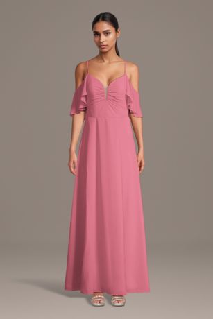 Soft chiffon flows gracefully on this A-line dress, styled with a chic notch neckline and airy cold-shoulder sleeves. A graceful look with a modern twist that's perfect for bridesmaids or any special occasion.