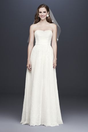 Soft and flowing, this light and airy A-line wedding dress is crafted of romantic eyelet chiffon. Button loop trim at the neckline adds a charming finishing touch.