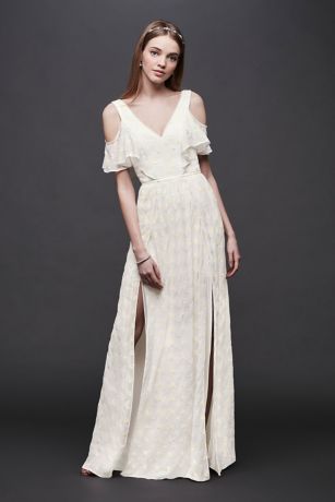 Perfect for a garden ceremony or beach wedding, this flowy chiffon sheath dress is every boho bride's dream. Features an eyelet skirt with two front slits, and a softly ruffled bodice.