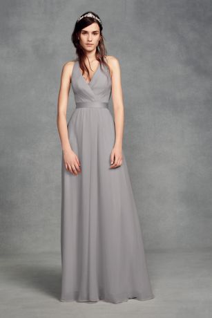 Featuring a plunging V-neckline and a layered chiffon-over-tulle skirt for a little fullness, this White by Vera Wang bridesmaid dress makes a style statement with a bold tulle bow at the nape of the neck.