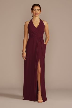 Breezy chiffon fabric makes this faux wrap halter bridesmaid dress a versatile stunner. Plus, the A-line skirt has a slit and pockets!