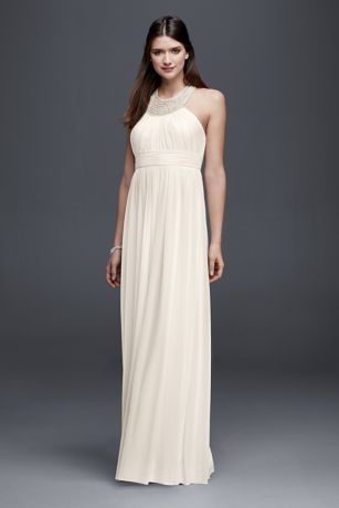 You'll feel strikingly beautiful in this chiffon sheath wedding dress designed with exquisite details. Shining beads adorn the halter neckline, and illusion back straps ensure you'll stun from every angle.