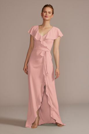 Oooh, ruffles! This chiffon bridesmaid dress is full of pretty movement, from the flowy short sleeves to the high-low hem. Features an open keyhole back and tie sash.