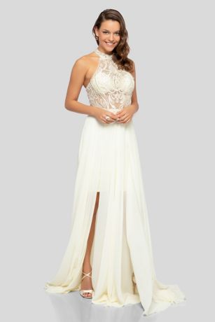 Hit the dance floor in this unforgettable high-neck halter prom dress featuring a beaded illusion lace bodice and a sweeping chiffon overskirt.