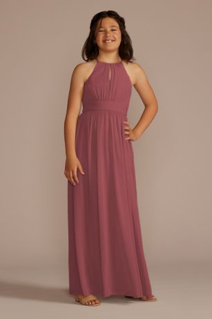 Graceful pleating and a high neckline add elegance to this long junior bridesmaid dress. A pleated panel at the waist completes the look.