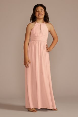 Graceful pleating and a high neckline add elegance to this long junior bridesmaid dress. A pleated panel at the waist completes the look.