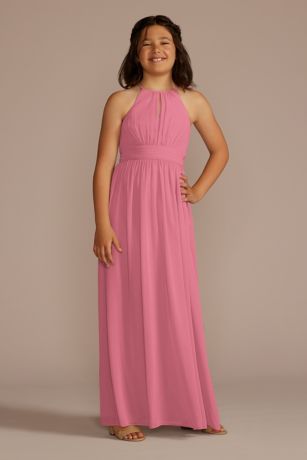 Graceful pleating and a high neckline add elegance to this long junior bridesmaid dress. A pleated panel at the waist completes the look.