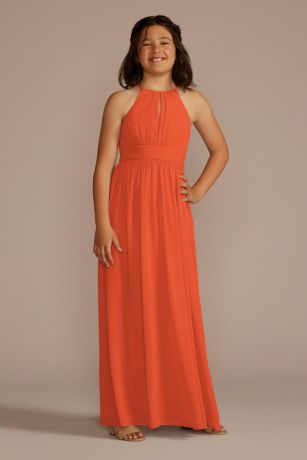 Graceful pleating and a high neckline add elegance to this long junior bridesmaid dress. A pleated panel at the waist completes the look.