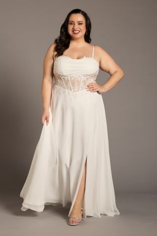 This graceful A-line wedding dress combines airy chiffon with an illusion lace bodice. The flowing skirt and cowl neckline add a touch of elegance.