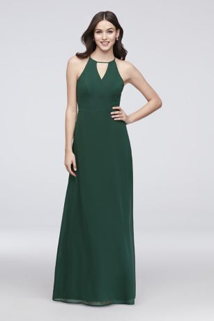 A keyhole neckline and angular, cutaway back add chic detail to this long chiffon bridesmaid dress.