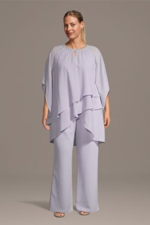 This chiffon two-piece pantsuit features a flattering keyhole detail and a flowing, elegant silhouette. Lightweight and polished, it's a comfortable yet sophisticated option for weddings and special occasions.