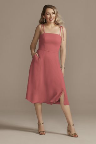A modern midi bridesmaid dress with spaghetti straps that tie for the perfect fit. A skirt slit adds a flirty touch.