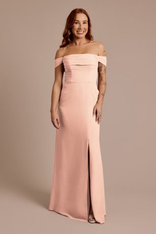 This chiffon off-the-shoulder dress showcases elegant draping that creates a soft, romantic silhouette for bridesmaids and special occasions.