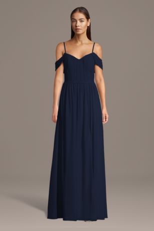 This chiffon A-line dress exudes effortless elegance with its off-the-shoulder neckline and pleated bodice. Soft, flowing fabric creates a graceful silhouette, while side pockets add a practical touch. Perfect for bridesmaids or other special occasions.