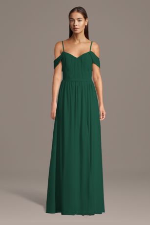 This chiffon A-line dress exudes effortless elegance with its off-the-shoulder neckline and pleated bodice. Soft, flowing fabric creates a graceful silhouette, while side pockets add a practical touch. Perfect for bridesmaids or other special occasions.