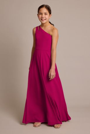 A cutout adds an extra dose of fun to this chiffon one-shoulder junior bridesmaid dress.