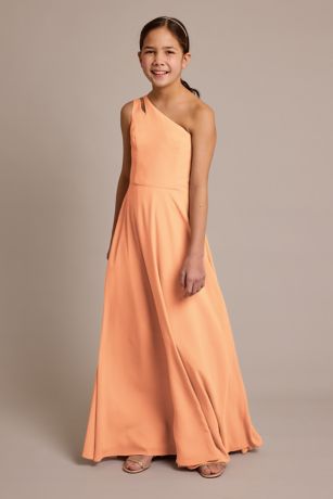 A cutout adds an extra dose of fun to this chiffon one-shoulder junior bridesmaid dress.