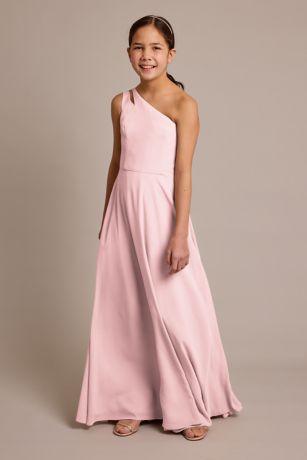 A cutout adds an extra dose of fun to this chiffon one-shoulder junior bridesmaid dress.