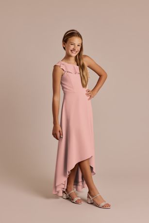 A whimsical ruffle one-shoulder neckline and high-low skirt gives this junior chiffon A-line skirt endless charm for younger members of the bridal party.