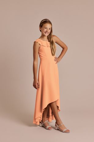 A whimsical ruffle one-shoulder neckline and high-low skirt gives this junior chiffon A-line skirt endless charm for younger members of the bridal party.