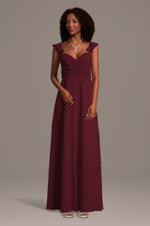 Lightweight chiffon flows beautifully on this A-line dress, designed with soft ruffle sleeves, a ruched bodice, and convenient side pockets. A graceful style with modern ease that's perfect for bridesmaids and partygoers.