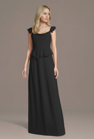 This chiffon A-line dress features delicate ruffle straps and a soft asymmetrical peplum detail for a romantic, feminine touch. Perfect for bridesmaids, parties, or special occasions.