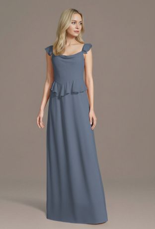 This chiffon A-line dress features delicate ruffle straps and a soft asymmetrical peplum detail for a romantic, feminine touch. Perfect for bridesmaids, parties, or special occasions.