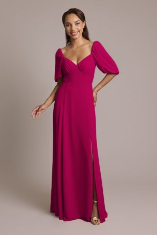 A beautiful option for a garden wedding, this chiffon bridesmaid dress features short puffed sleeves, an eye-catching low back, and elegant fabric-covered back buttons. The flowing A-line skirt is full of easy movement, so you can dance all night long!