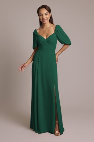 A beautiful option for a garden wedding, this chiffon bridesmaid dress features short puffed sleeves, an eye-catching low back, and elegant fabric-covered back buttons. The flowing A-line skirt is full of easy movement, so you can dance all night long!